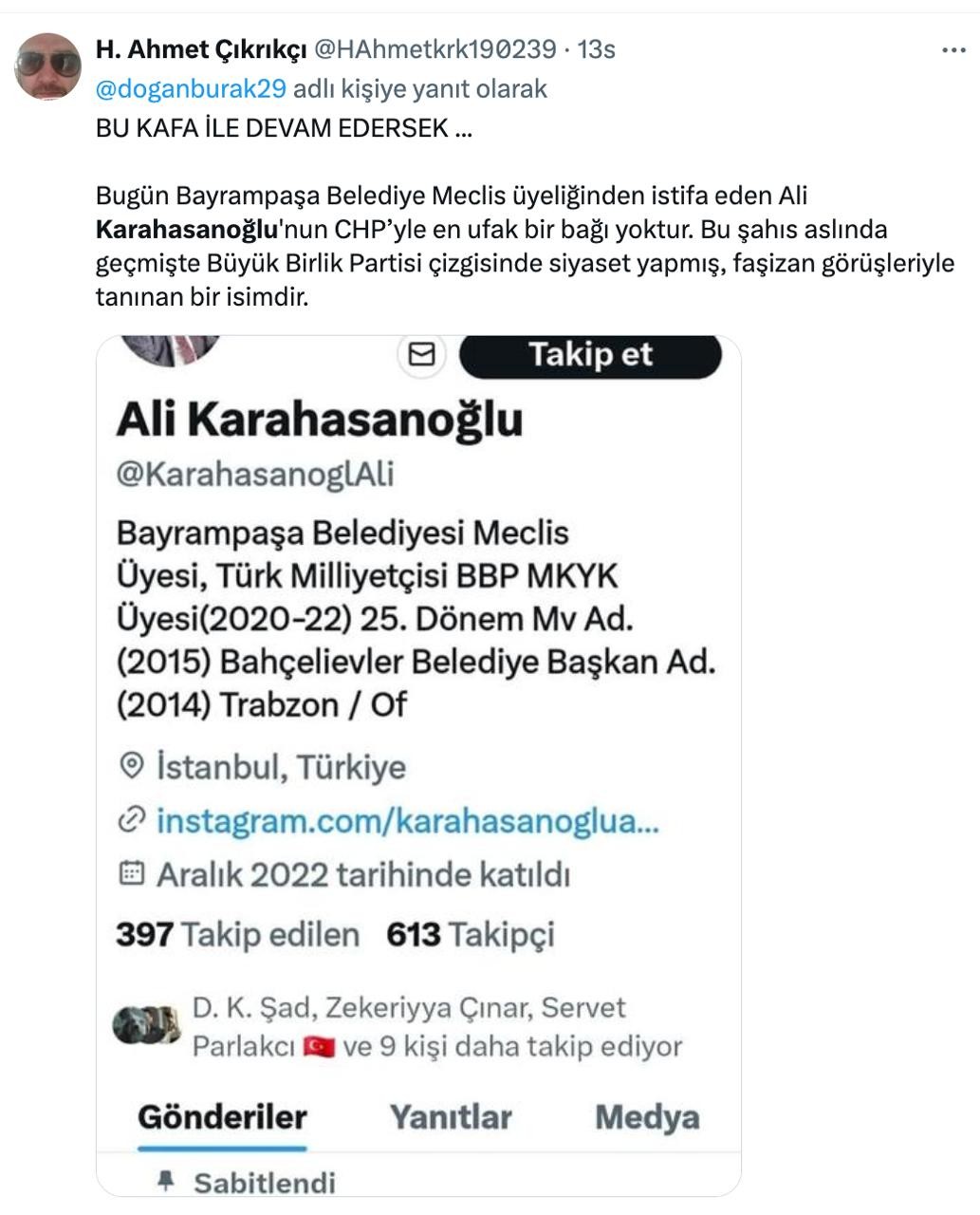 CHP’lilerin sırf Erdoğan düşmanlığı yapsın diye BBP’den transfer ettikleri Ali Karahasanoğlu kemalistlere beklediklerini vermedi, CHP’den istifa etti. Bunun üzerine CHP’liler, Ali Karahasanoğlu’na hakarete varan ifadeler kullandılar.