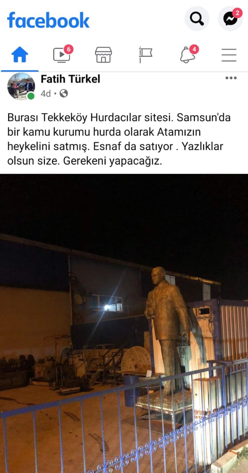 Samsun'da CHP İl Başkanı Fatih Türkel ve bazı vatandaşların bir kamu kurumunun Atatürk heykelini Tekkeköy ilçesinde bir hurdacıya sattığı yönünde sosyal medyada yaptığı paylaşımlar üzerine, konuyla ilgili Samsun İl Emniyet Müdürlüğü bir açıklama yaptı.