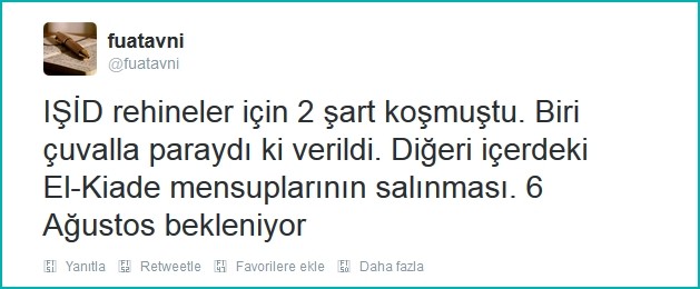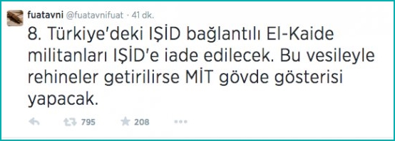 Pensilvanya fenomeni Fuatavni'nin son olarak ortaya attığı iddiaya göre, Türkiye'deki El-Kaide militanları IŞİD'e iade edilecek ve bu vesile ile rehineler getirilirse MİT'in gövde gösterisi yapması sağlanacak. Ancak aynı hesap üzerinden dile getirilen ve Paralel İhanet Çetesi'nin ajansı olduğu iddia edilen CHA ve Paralel sözcü Zaman gazetesi tarafından 1 Ağustos'ta alıntılanan "IŞİD" konulu iddialarda Avni, anlaşma gereği El-Kaide mensuplarının serbest bırakılması için 6 Ağustos'un beklendiğini söylenmişti.