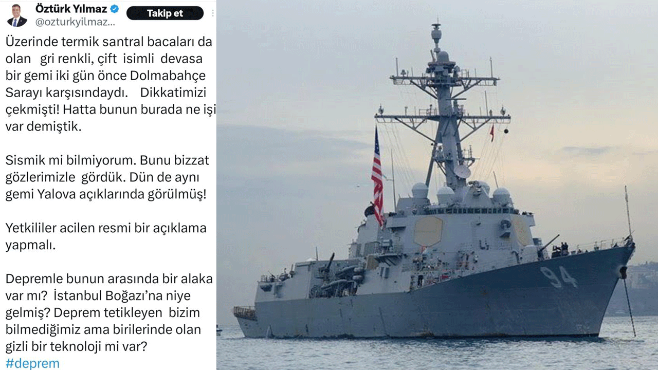 İstanbul'da öğlen saatlerinde yaşanan ve büyük paniğe sebep olan 6.2'lik depremin ardından yine o bilindik komplo teorisinin ortaya atılması gecikmedi. Üzerinde Amerikan bayrağı yer alan bir gemi fotoğrafı paylaşan Yenilik Partisi Genel Başkanı Öztürk Yılmaz, "Depremle bunun arasında bir alaka var mı? İstanbul Boğazı’na niye gelmiş? Deprem tetikleyen bizim bilmediğimiz ama birilerinde olan gizli bir teknoloji mi var?" diye sordu.