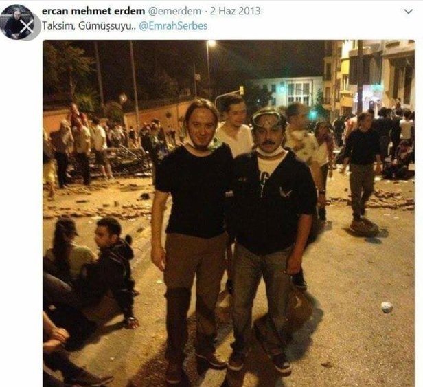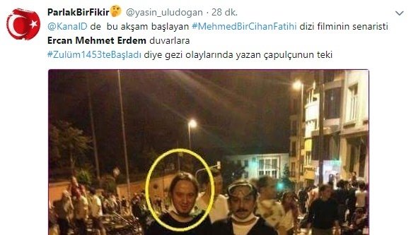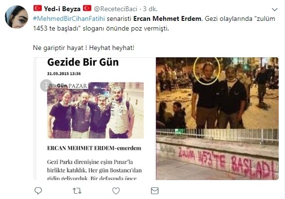 Gezi'de Emrah Serbes ile bir fotoğrafta boy gösteren senarist Ercan Mehmet Erdem'in, Türk bayrağının yakıldığı ve "Zulüm 1453'te başladı" sloganlarıyla Fatih Sultan Mehmed Han'a dil uzatıldığı Gezi kalkışmasının bir neferi olduğu ortaya çıktı.
