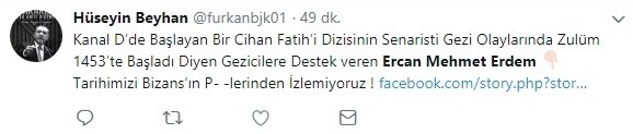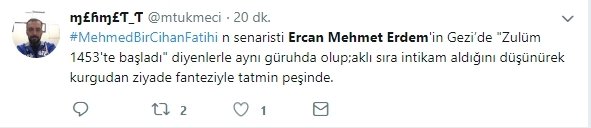 Kanal D'de yayınlanan ve daha yayınlandığı ilk bölümüyle büyük bir skandala imza atan Mehmed Bir Cihan Fatihi dizisinin senaristinin Gezi Parkı provokasyonları sırasında "Zulüm 1453'te başladı" diyenlerle kol kola olduğu ortaya çıktı.