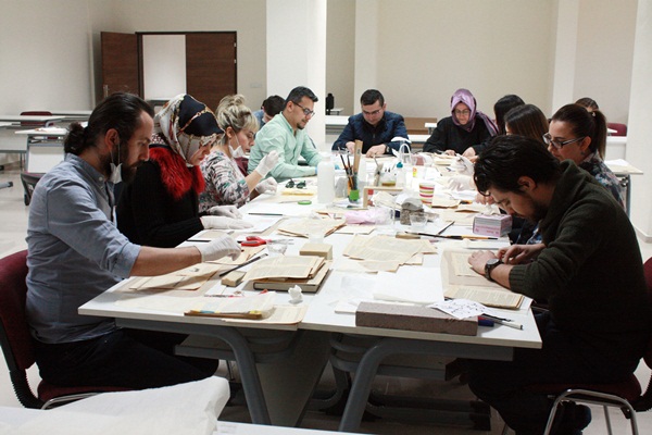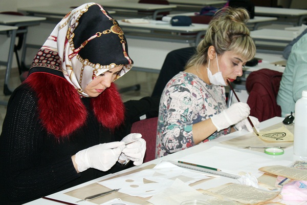 Gönüllü 13 eğitimci, restorasyon uzmanından aldıkları eğitimi pratiğe döktü. Eğitimciler, yıpranmış yazılı eserleri onararak tekrar kullanılabilir hale getiriyor.
