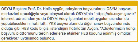 HES Kodunun Edinilmesi: Sınava başvuracak 0’la başlayan YU numaralı adaylar hariç tüm adayların, sınava başvuru işlemi yapmadan önce HES kodunu edinmiş olmaları gerekmektedir. Adaylar, HES kodunun nasıl alınacağı bilgisine Sağlık Bakanlığının https://hayatevesigar.saglik.gov.tr internet adresinden ulaşabileceklerdir. Adaylar, sahip olduğu HES kodunun ÖSYM sistemine kaydını ÖSYM Aday İşlemleri Sisteminde (https://ais.osym.gov.tr) PROFİLİM alanında bulunan “HES KODU BİLGİLERİM” sayfasından yapacaklardır. Bu sınav için kullanılacak olan HES kodunun geçerlilik bitiş tarihinin, bu sınavın yapılacağı günden bir gün sonrası veya daha ileri tarihli olması gerekmektedir.