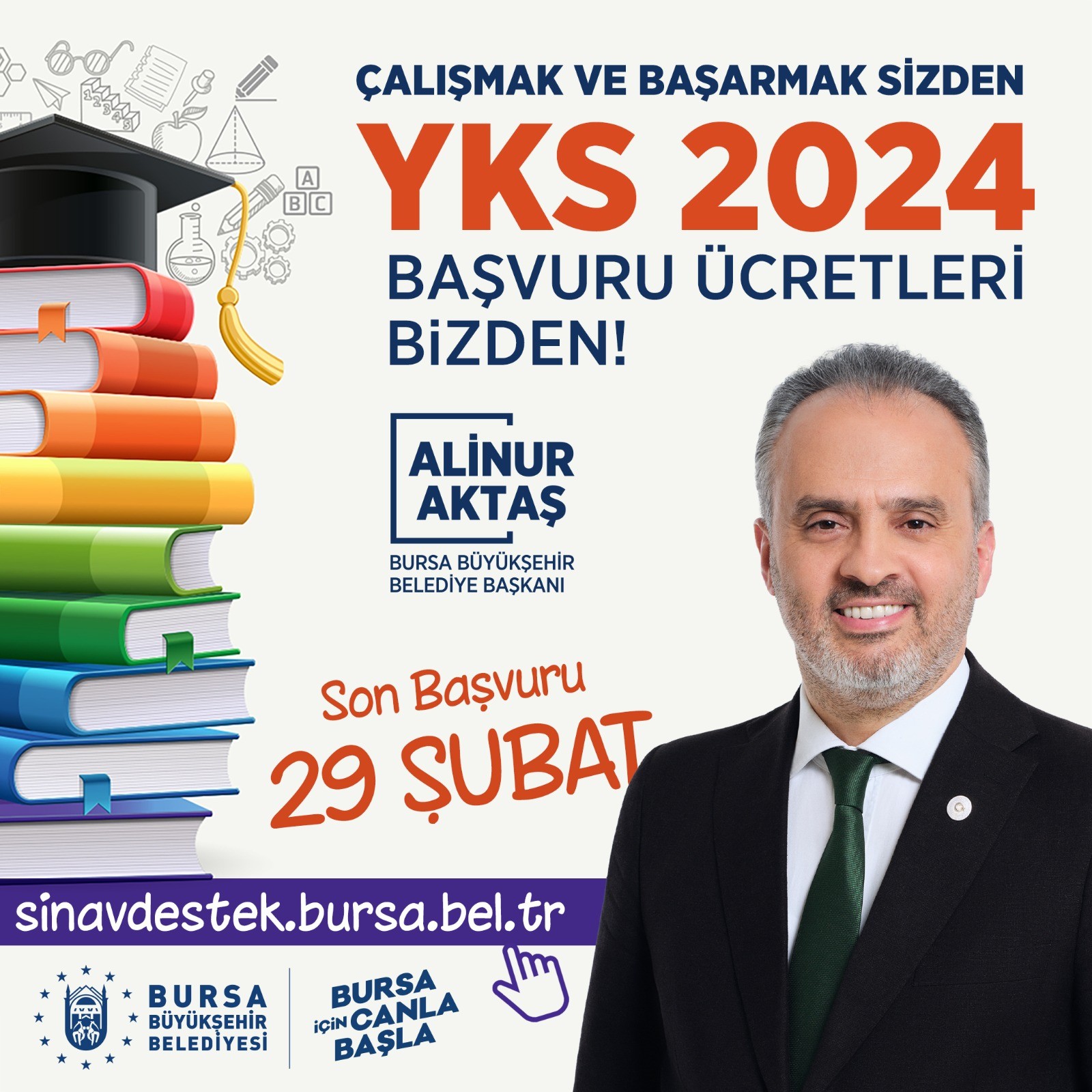 Üniversite sınavına hazırlanan gençlere müjdeyi bizzat kendi veren Bursa Büyükşehir Belediye Başkanı Alinur Aktaş, gençlere ve eğitime sundukları katkılarla ülkenin geleceğini daha sağlam ve daha güçlü bir şekilde inşa ettiklerini söyledi. BURSKOOP marifetiyle üniversite ve meslek lisesi öğrencilerine sağlanan bursların kapsamını lisans, yüksek lisans ve doktora öğrencilerini de kapsayacak şekilde genişlettiklerini ifade eden Başkan Aktaş, “Biliyorsunuz ki şehit ve gazilerimizin çocuklarının Yükseköğretim Kurumlarına giriş sınavında ücreti, Aile ve Sosyal Hizmetler Bakanlığımız tarafından karşılanıyor. Bizler de Bursa Büyükşehir Belediyesi olarak bu desteği şehrimizde YKS’ye girecek tüm ihtiyaç sahibi öğrencilerimiz için uyguluyoruz. Şehrimizdeki devlet okulları, özel okullar ve açık liselerde okumakta olan ya da mezun olan öğrencilerimizin; gerekli şartları taşımaları ve onaylanmış sınav başvuru formlarını ekleyerek sınavdestek.bursa.bel.tr adresi üzerinden 29 Şubat tarihine kadar online başvuru yapmaları halinde ödedikleri sınav ücretlerini hesaplarına iade ediyoruz. Verdiğimiz sözleri bir bir tutuyoruz. Çalışmak ve başarmak gençlerimizden, geleceğiniz için her türlü destek bizden” diye konuştu.