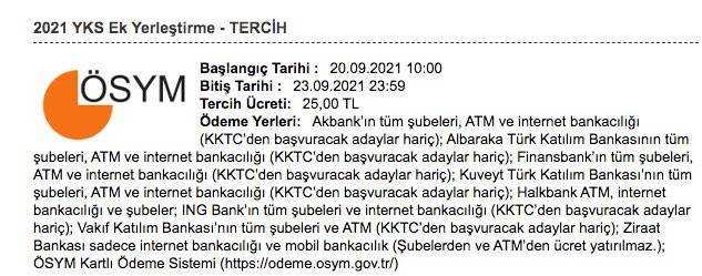 YKS ek tercih ücreti ne kadar 2021 ÖSYM ek yerleştirme tercih ücreti hangi banka