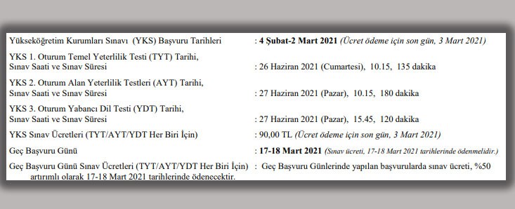 YKS başvuru tarihi ise 4 Şubat 2021'de başladı ve 2 Mart 2021'e kadar devam edecek. Ayrıca adaylar 17-18 Mart 2021 tarihlerinde geç başvuruda bulunabilecekler. YKS başvuru ücreti konusunda açıklamanın ise başvuru başlangıç tarihinde yayımlanacak başvuru kılavuzunda yapılması bekleniyor. Geçtiğimiz yıl YKS başvuru ücreti her bir oturum için 70 lira olarak açıklanmıştı Geç başvuru ücreti ise 105 lira olmuştu.
