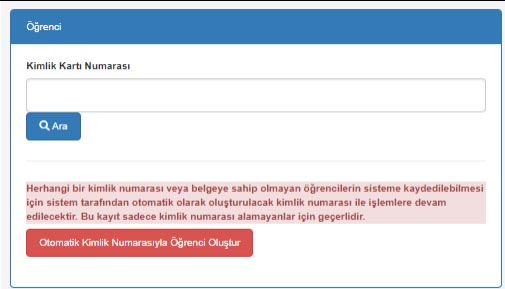 Açılan sayfa üzerinde yer alan ‘Kimlik Kartı Numarası’ alanına kaydını yapmak istediğiniz öğrenciye ait Yabancı Tanıtma Belgesi üzerinde yer alan yabancı kimlik numarasını girip Ara tuşuna basarak öğrenciyi sorgulayabilirsiniz. Öğrenci sorgulama işlemi sonucunda 4 farklı durum oluşabilir. Bu durumlar bu kimlik numarasına bağlı herhangi bir öğrencinin olmaması, mevcut sistem üzerinde kayıtlı silinmiş bir kaydın olması, mevcut sistem üzerinde kayıtlı farklı bir okul üzerinde kayıtlı olması veya e-Okul üzerinde kaydının olmasıdır.