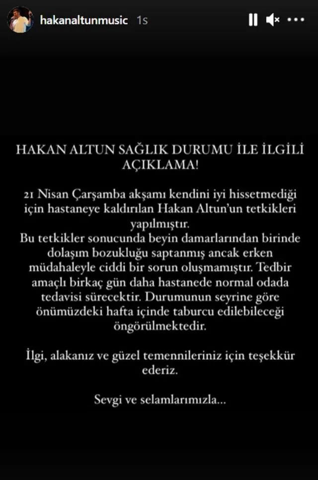 "21 Nisan Çarşamba akşamı kendini iyi hissetmediği için hastaneye kaldırılan Hakan Altun'un tetkikleri yapılmıştır. Bu tetkikler sonucunda beyin damarlarından birinde dolaşım bozukluğu saptanmış ancak erken müdahaleyle ciddi bir sorun yaşanmamıştır. Tedbir amaçlı birkaç gün daha hastanede normal odada tedavisi sürecektir. Durumunun seyrine göre önümüzdeki hafta içinde taburcu edilebileceği öngörülmektedir."