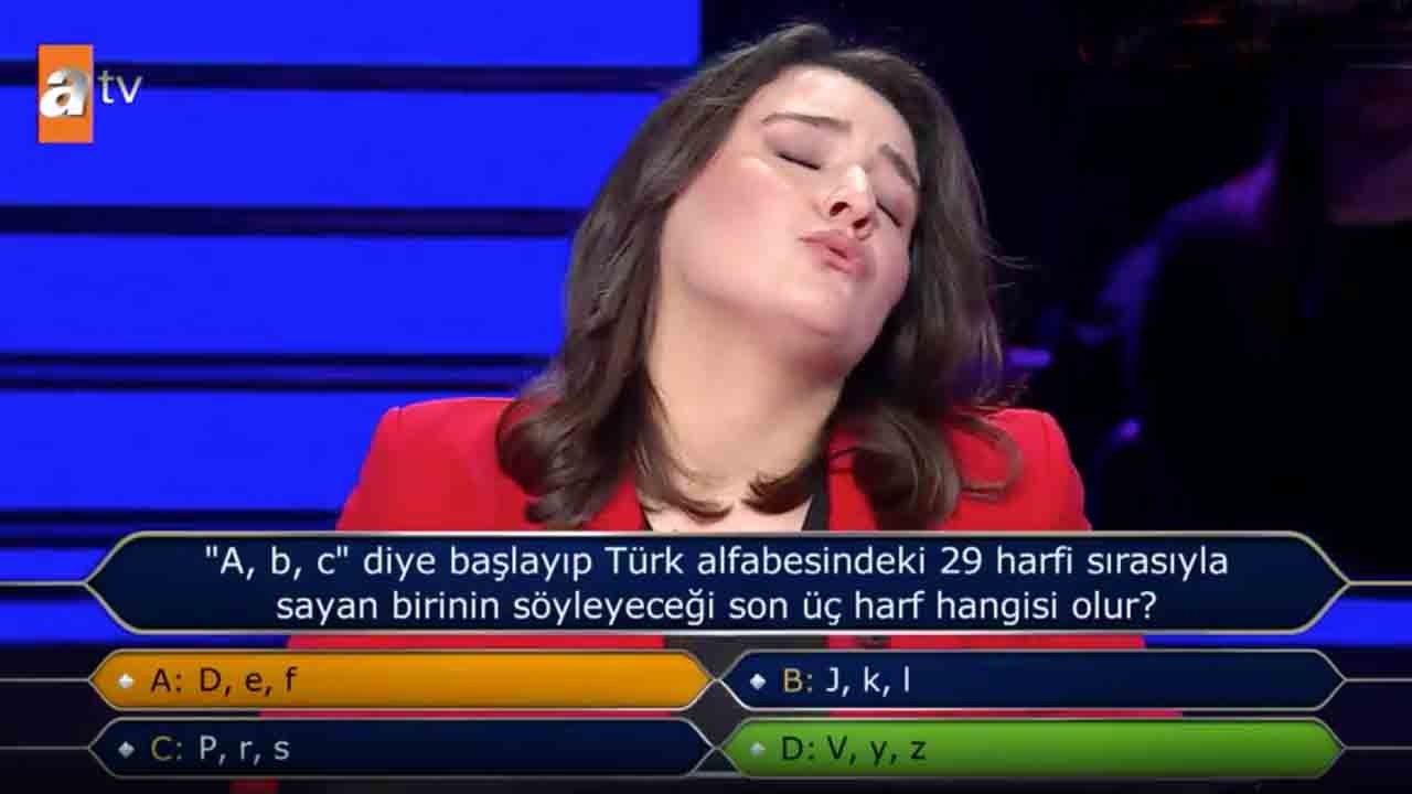 Yarışmacının karşısına, Türk alfabesindeki 29 harfin baştan sona sayılması durumunda söylenecek son üç harfin hangileri olduğu sorusu çıktı. Tereddüt etmeden verdiği cevapla hataya düşen yarışmacı, doğru şıkkı görünce büyük şaşkınlık yaşadı.