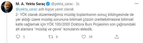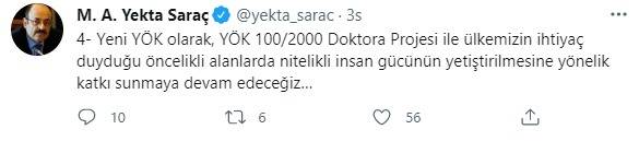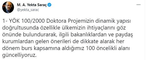 Prof. Dr. Mehmet Ali Yekta Saraç yaptığı paylaşımda, “YÖK 100/2000 Doktora Projemizin dinamik yapısı doğrultusunda özellikle ülkemizin ihtiyaçlarını göz önünde bulundurarak, ilgili bakanlıklardan ve paydaş kurumlardan gelen önerileri de dikkate alarak her dönem burs kapsamına aldığımız 100 öncelikli alanı güncelliyoruz. YÖK olarak düzenlediğimiz müsilaj toplantısının sonuç bildirgesinde de yer aldığı üzere müsilaj sorununa bilimsel çözüm üretilebilmesine bilimsel katkı sağlamak için YÖK 100/2000 Doktora Burs Projesinin son çağrısındaki alt alanlara "müsilaj ve çevre" konularını ekledik. Böylelikle müsilaj sorununa çözüm üretilebilmesine katkı verecek nitelikli bilim insanlarının yetiştirilmesi için "deniz ekosistemlerinin sürdürülebilirliği", "çevre ve atık" alanlarında doktora yapacak kişilere burs vereceğiz. Yeni YÖK olarak, YÖK 100/2000 Doktora Projesi ile ülkemizin ihtiyaç duyduğu öncelikli alanlarda nitelikli insan gücünün yetiştirilmesine yönelik katkı sunmaya devam edeceğiz…” ifadelerini kullandı.