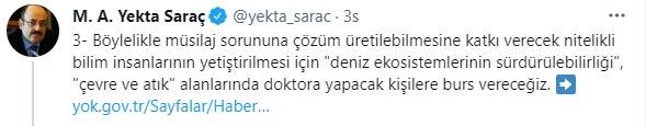 YÖK Başkanı Prof. Dr. M. A. Yekta Saraç sosyal medya hesabı üzerinden yaptığı paylaşımda, Marmara Denizi’ni etkisi altına alan ve canlı popülasyonunu büyük oranda tehdit eden müsilaj sorununa karşı çözüm üretebilmesine katkı verecek nitelikli bilim insanlarının yetiştirilmesi için "Deniz ekosistemlerinin sürdürülebilirliği", "Çevre ve atık" alanlarında doktora yapacaklara burs verilmesini kararlaştırdığını duyurdu.