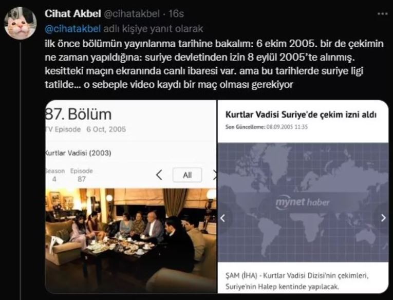 "İlk önce bölümün yayınlanma tarihine bakalım: 6 ekim 2005. Bir de çekimin ne zaman yapıldığına: Suriye devletinden izin 8 eylül 2005’te alınmış. Kesitteki maçın ekranında canlı ibaresi var ama bu tarihlerde Suriye ligi tatilde… O sebeple video kaydı bir maç olması gerekiyor. Şu kısımda spiker 'ittihad' diyor. yani takımlardan birisinin içinde ittihad var. O sezon sadece isminde ittihad geçen takım Al ittihad Halep futbol kulübü…