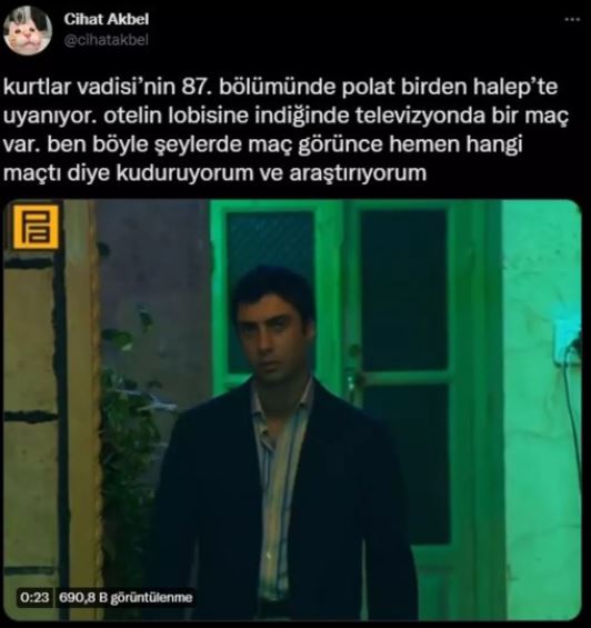 Bir döneme damga vuran Kurtlar Vadisi'ne dair hiç bilinmeyen detaylar zaman zaman gündeme geliyor. Twitter'da Cihat Akbel adlı kullanıcı Kurtlar Vadisi 87. bölümü izlerken Polat Alemdar'ın Halep'te uyandığı sahnede otel lobisinde gösterilen maçı merak edince araştırmaya başladı.