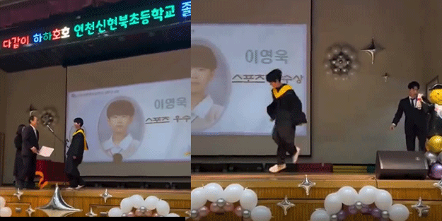 Güney Kore'de liseden mezun olan genç diplomasını almak için sahneye gittiği esnada yaptığı şovla salondaki herkesi şaşkına çevirdi. Ayaklarını hızlı bir şekilde hareket ettirerek havada yürüyormuş izlenimi veren genç çocuk arkadaşları ve müdürünün büyük beğenisini topladı.