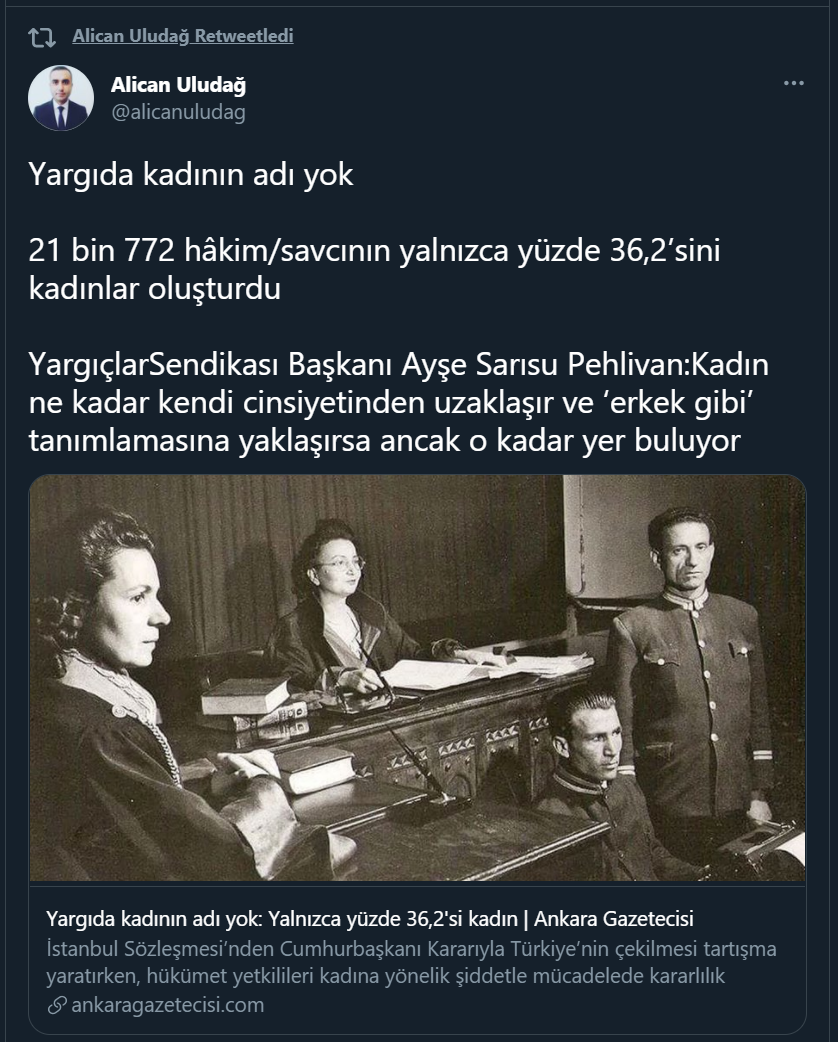 Türkiye'nin İstanbul Sözleşmesi'nden çekilmesini hatırlatarak konuyu yargıdaki kadınlara bağlayan Alican Uludağ, yazıda, "Kadın hâkim sayısı erkeklere yaklaştı" ifadesine yer vererek tüm yazdıklarını da boşa çıkarmış oldu.