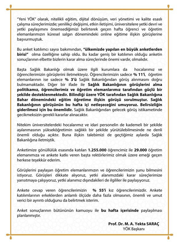 Üniversitelerde yüz yüze eğitim başlayacak mı? YÖK Başkanı Prof Dr. Yekta Saraç, Üniversitelerde yüz yüze eğitime ilişkin "Sağlık Bakanlığının görüşünün bu hafta içi netleşeceğini umuyoruz." dedi. Saraç, "Sağlık Bakanlığından gelecek görüş istikametinde gecikmeksizin gerekli kararlar alınacaktır." açıklamasında bulundu.