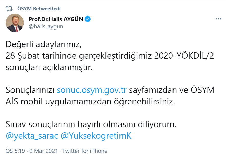 28 Şubat 2021 tarihinde uygulanan 2020 Yükseköğretim Kurumları Yabancı Dil Sınavına (2020-YÖKDİL/2) ait değerlendirme işlemleri tamamlanmıştır.