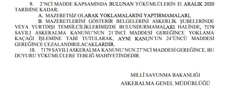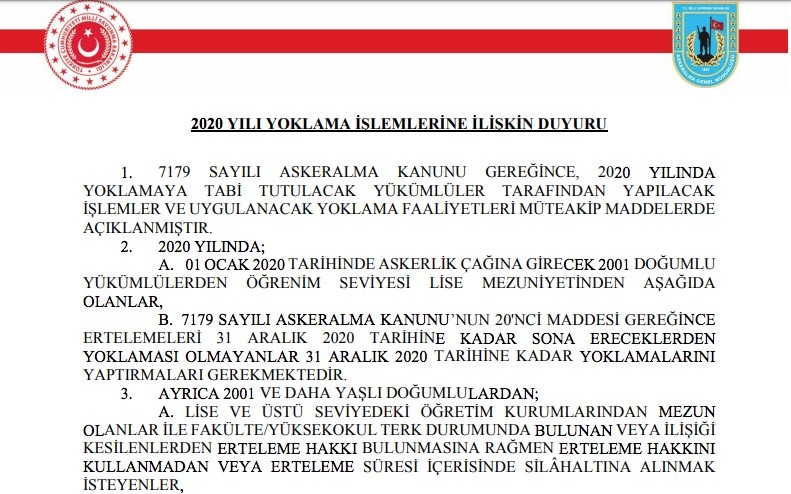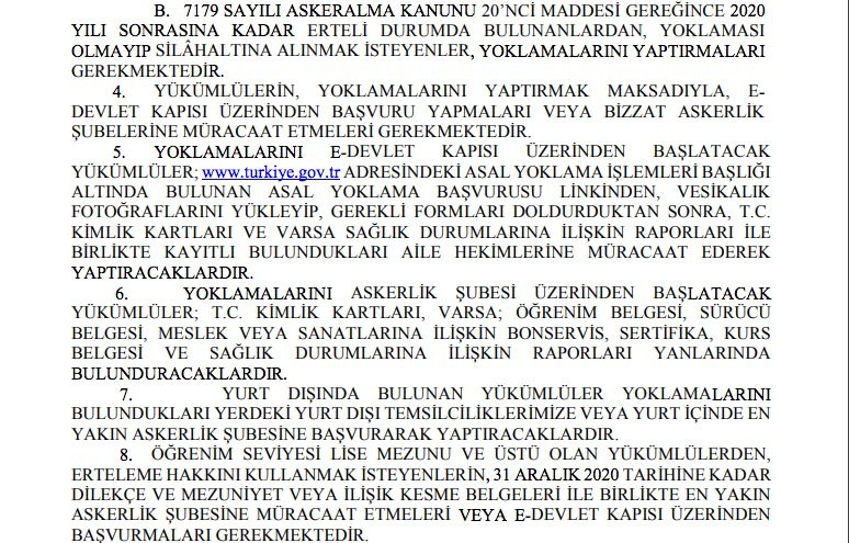 TBMM Genel Kurulunda, yeni askerlik sistemi teklifinin 4 maddesi kabul edildi. Yoklama kaçağı, bakaya veya saklı olanlar, 1 Kasım 2019’a kadar başvurmaları ve bedeli peşin ödemeleri şartıyla bedelli askerlikle ilgili hükümlerden yararlanabildiler.