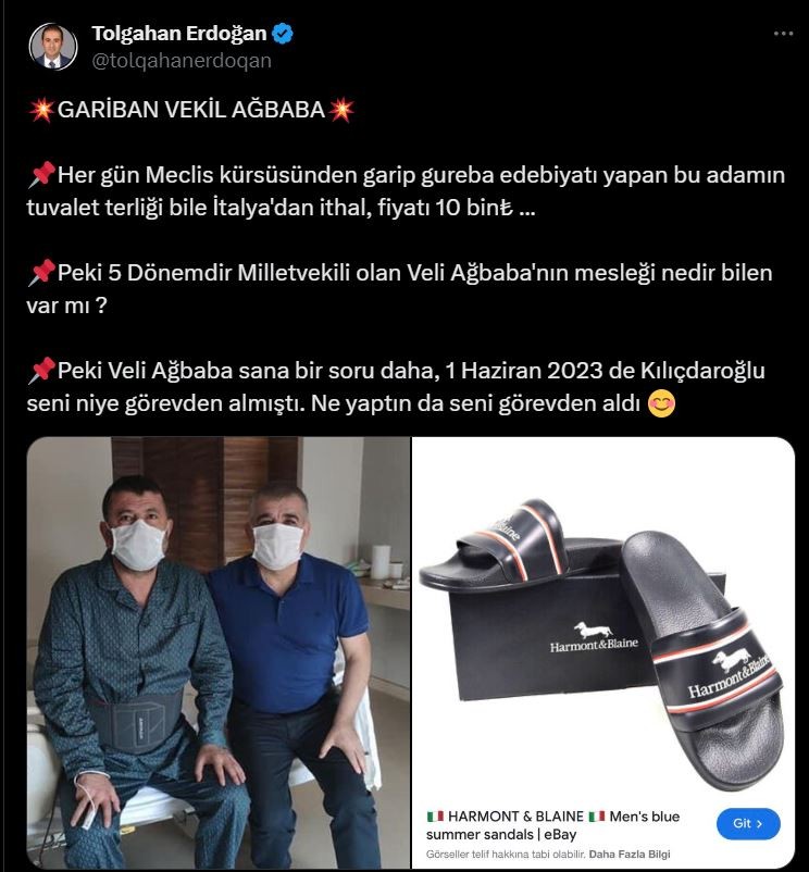 Erdoğan sosyal medya hasabından yaptığı açıklamada, "GARİBAN VEKİL AĞBABA; Her gün Meclis kürsüsünden garip gureba edebiyatı yapan bu adamın tuvalet terliği bile İtalya'dan ithal, fiyatı 10 bin₺ ... Peki 5 Dönemdir Milletvekili olan Veli Ağbaba'nın mesleği nedir bilen var mı? Peki Veli Ağbaba sana bir soru daha, 1 Haziran 2023 de Kılıçdaroğlu seni niye görevden almıştı. Ne yaptın da seni görevden aldı" sözleriyle tepki gösterdi.