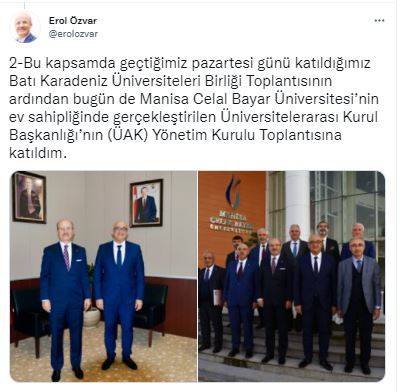 Manisa Celal Bayar Üniversitesinin ev sahipliğinde yapılan Üniversitelerarası Kurul Başkanlığının (ÜAK) Yönetim Kurulu Toplantısına katılım gösteren YÖK Başkanı Erol Özvar, sosyal medya hesabından yaptığı açıklamada, “YÖK olarak, üniversitelerimizle sıkça bir araya gelmeyi ve birlikte çalışmayı planlıyoruz.” dedi.