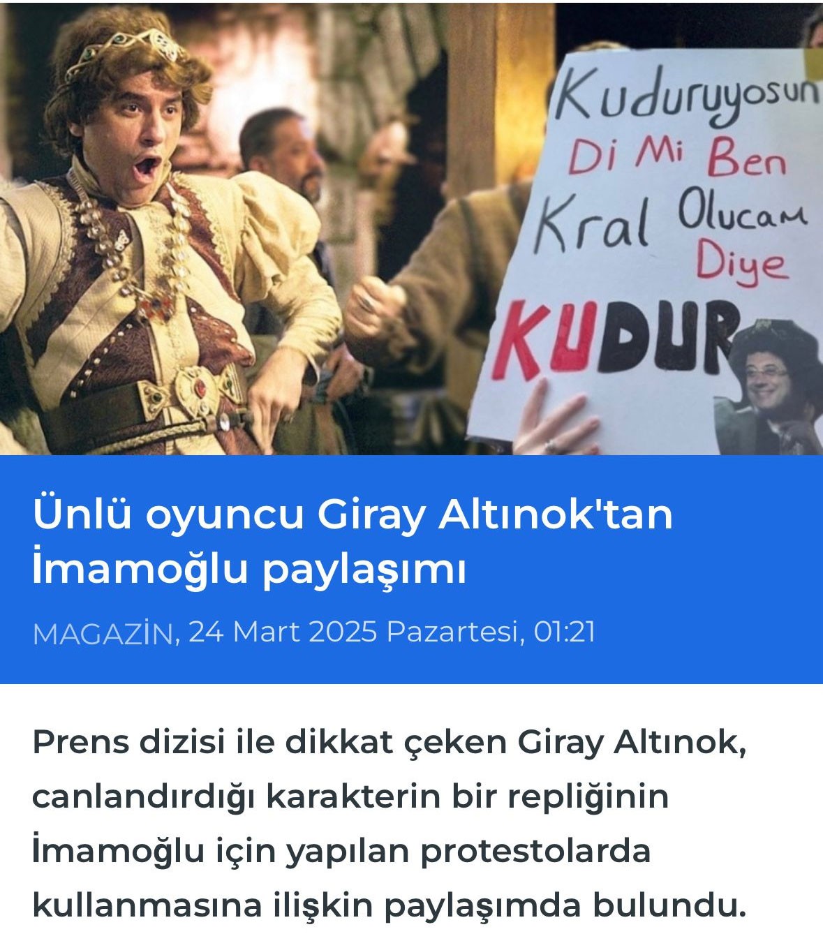 Ünlü oyuncu Giray Altınok, 560 milyar liralık yolsuzluk operasyonuyla tutuklanan CHP’li suç örgütü lideri Ekrem İmamoğlu’na sosyal medyada yalakalık yaptı, ödülü kaptı! 24 Mart 2025’te “Kuduruyosun di mi ben olucam kral diye” pankartıyla İmamoğlu’nu öven paylaşım yapan Altınok, günler sonra İBB’nin Genç Günler söyleşisine davet edildi.