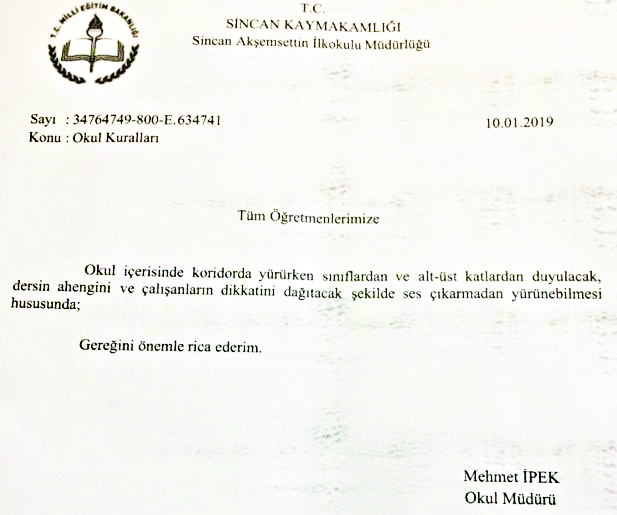 MEB tarafından görevden alınan Müdür Mehmet İpek’in kararının bir yansıması olan ÖSYM yönergesi, İpek’e yapılan haksızlığı gözler önüne serdi. Sincan Akşemsettin İlkokulu Müdürü Mehmet İpek de ÖSYM yönergesiyle paralellik arz eden 10.01.2019’da öğretmenlere yönelik talimnamesinde, “Okul içerisinde koridorda yürürken sınıflardan ve alt-üst katlardan duyulacak, dersin ahengini ve çalışanların dikkatini dağıtacak şekilde ses çıkarmadan yürünebilmesi hususunda gereğini önemle rica ederim” ifadelerine yer vermişti. Laikçi azınlığın “topuklu ayakkabı yasağı” olarak çarpıttığı uygulamadan dolayı müdürü tebrik etmesi gereken MEB önce soruşturma başlatmış ardından müdür İpek’i görevden almıştı.