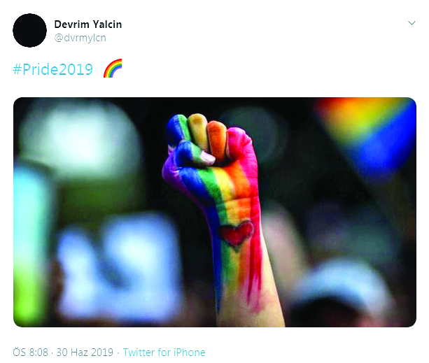 Sosyal medya hesabı üzerinden AK Parti’ye hakaret edenleri paylaşarak kahramanlığa soyunan Devrim Yalçın, eşcinsel sapkınlığa destek vermeyi ihmal etmedi. LGBT’li sapkınların sözde “27. İstanbul Onur Haftası”nı kutlayan Yalçın, “#Pride2019“ diyerek homoların yanında yer aldı.