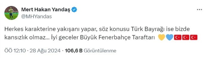 Mert Hakan yaptığı paylaşımda, ''Herkes karakterine yakışanı yapar, söz konusu Türk Bayrağı ise bizde kansızlık olmaz… İyi geceler Büyük Fenerbahçe Taraftarı'' ifadelerini kullandı.