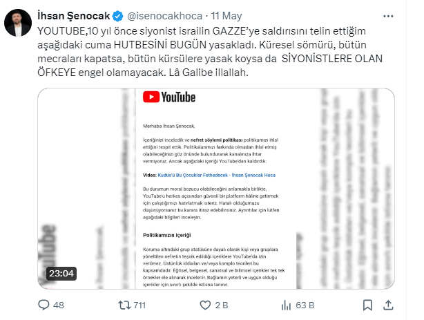 Fıkıh Doktoru İhsan Şenocak'ın 2014 yılında bir Cuma hutbesinde İsrail'i eleştiren ifadelerinin yer aldığı video, Youtube tarafından kaldırıldı.