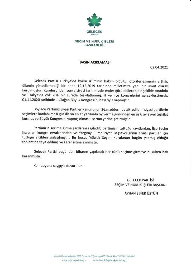 Gelecek Partisi, seçime girme yeterliliğini tamamladı. Konuya ilişkin Gelecek Partisi Kurucular Kurulu Üyesi, Seçim ve Hukuk İşleri Başkanı Ayhan Sefer Üstün tarafından yapılan açıklamada, partinin seçime girmek için gerekli şartları gerçekleştirdiği ve konunun bugün yapılan Yüksek Seçim Kurulu (YSK) toplantısında karara bağlandığı bildirildi.