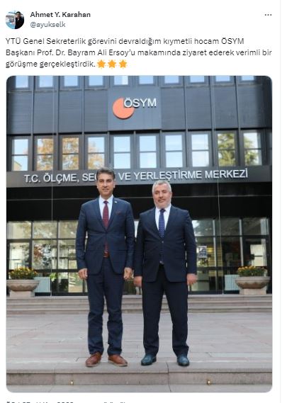 Karahan sosyal medya hesabından yaptığı paylaşımda,YTÜ Genel Sekreterlik görevini devraldığım kıymetli hocam ÖSYM Başkanı Prof. Dr. Bayram Ali Ersoy’u makamında ziyaret ederek verimli bir görüşme gerçekleştirdik. ifadelerine yer verdi.