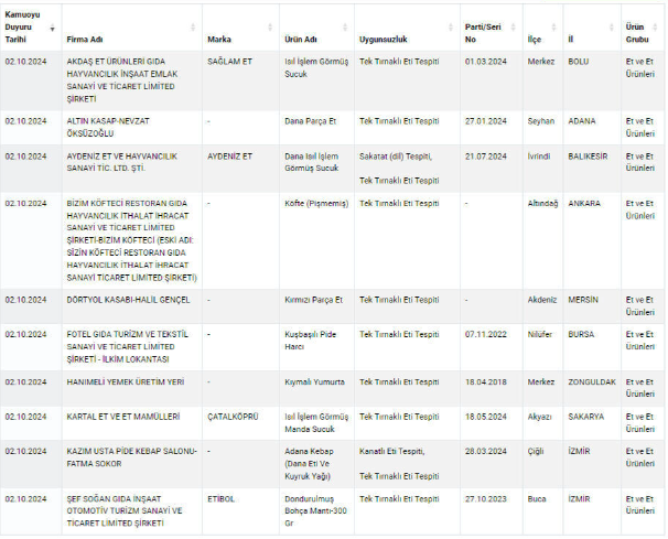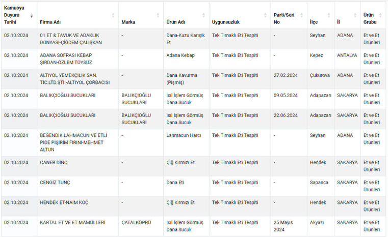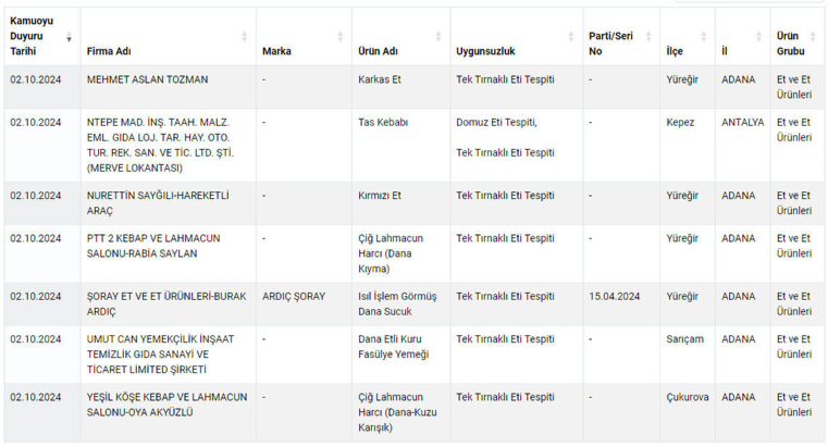 Bakanlığın yayınladığı listede özellikle kırmızı ette yapılan hileler dikkat çekiyor. Domuz etinin yanında at ve eşek etinin de vatandaşa yedirildiği ortaya çıktı.