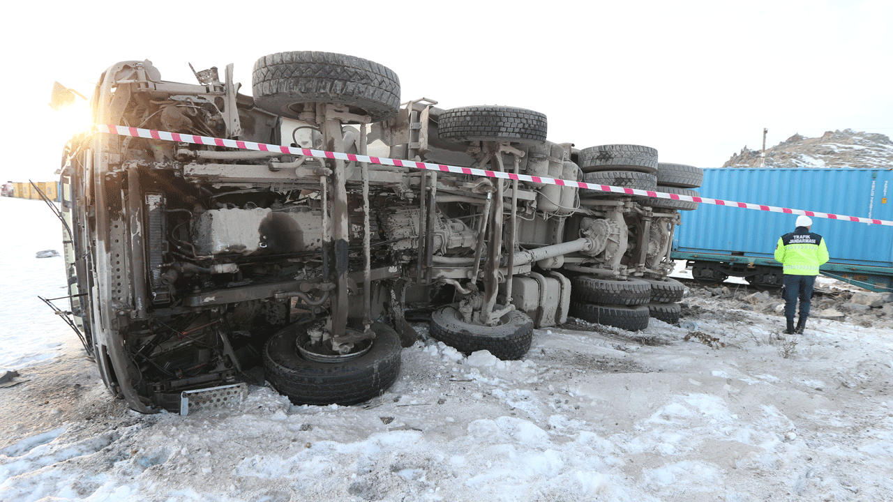 Kars'ta yük treninin hemzemin geçitte çarparak sürüklediği hafriyat kamyonunun sürücüsü hayatını kaybetti.