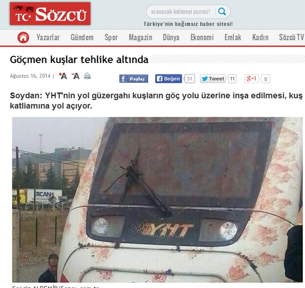 2013 yılının Kasım ayında Ankara’dan Eskişehir’e giden Yüksek Hızlı Tren (YHT), Eskişehir yakınlarında kuş sürüsüne çarpmış ve trenin ön tarafını kuşların kanı kaplamıştı.