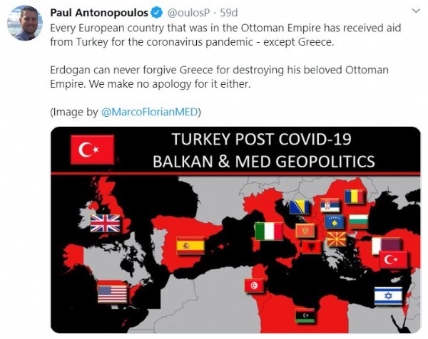 Türkiye'nin insani yardımı ise Yunan gazetecinin zoruna gitti. Twitter hesabı üzerinden Türkiye'nin yardım ettiği ülkeleri gösteren bir görsel paylaşan gazeteci Paul Antonopoulos, 'Osmanlı İmparatorluğu içindeki her Avrupa ülkesi -Yunanistan hariç- koronavirüs salgını için Türkiye'den yardım teslim aldı. Erdoğan, Osmanlı İmparatorluğu'nu yok ettiği için Yunanistan'ı asla affedemez. Bunun için özür de dilemiyoruz' şeklinde küstah ifadeler kullandı.