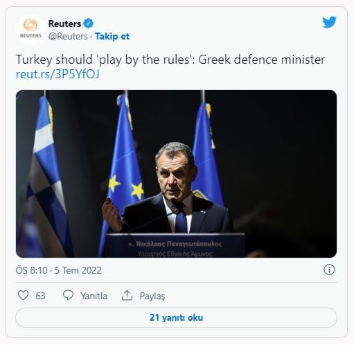 Yunanistan Savunma Bakanı Nikos Panagiotopoulos, masayı deviren taraf olduklarını unutup Türkiye'yi suçlamaya kalktı. Hatırlanacağı üzere iki ülke arasında; Türkiye-Yunanistan Yüksek Düzeyli İşbirliği Konseyi Toplantıları başlamış; bu kapsamda Miçotakis İstanbul'a gelerek Erdoğan'la görüşmüştü. Ancak Yunan Başbakan günler sonra ABD'ye gidip Kongre'de konuşma yaparak, Ankara'ya karşı sözler sarf etmiş ve "Türkiye'ye F-16'ları vermeyin" çalışması yapmıştı. Bu konuşmadan sonra Erdoğan, "Benim için Miçotakis diye biri artık yok" diyerek rest çekmiş, Madrid'deki NATO Liderler Zirvesi'nde de Yunan liderle görüşmemişti.
