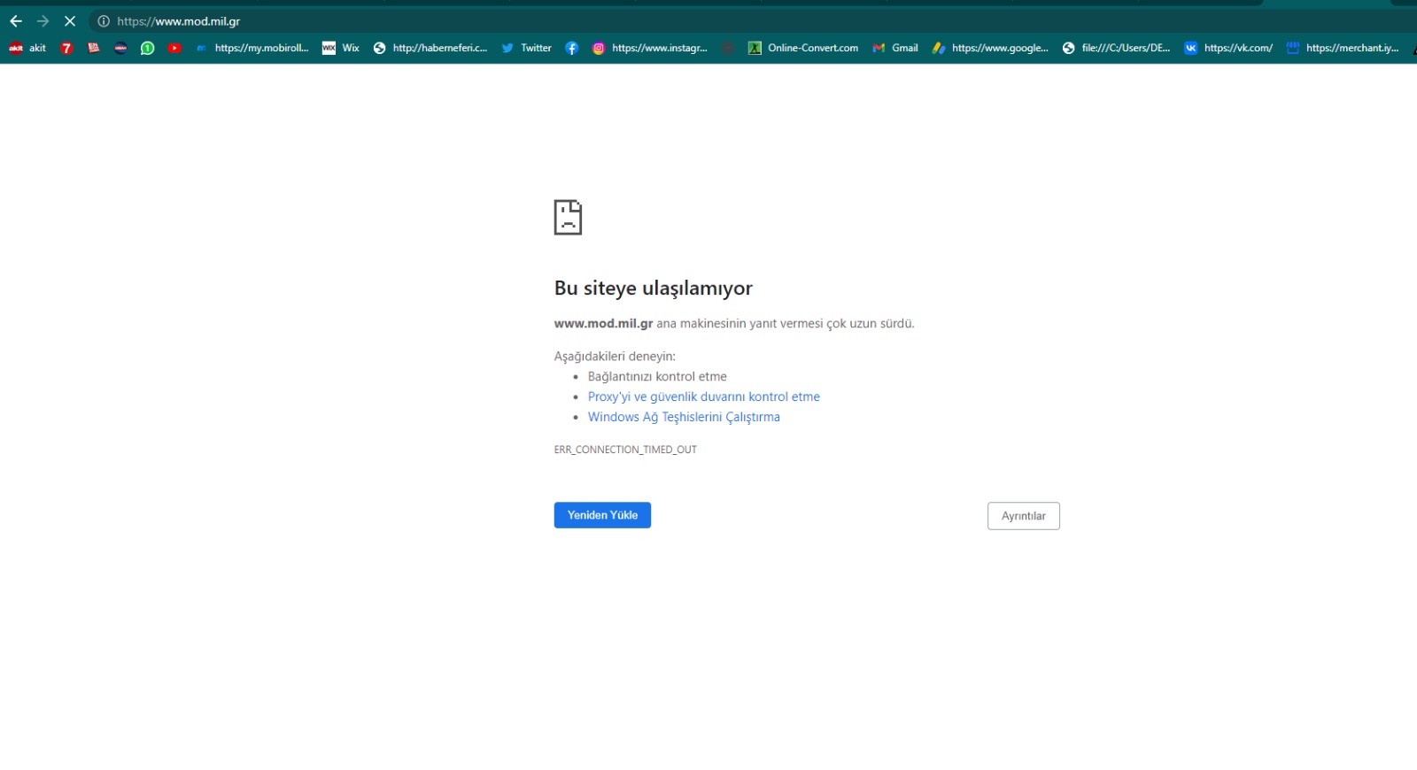 Yunanistan Savunma Bakanlığı'nın resmi sitesine girenler sayfaya ulaşamıyor ve şu görüntüyle karşılaşıyor: