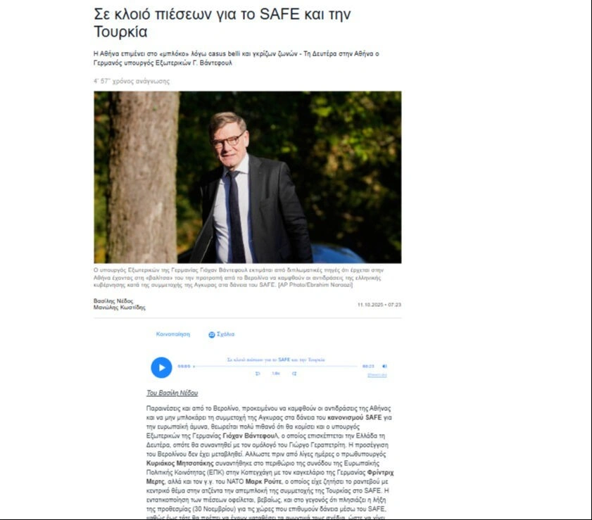 “Yunanistan, Avrupa güvenliğini kişisel ihtilaflara kurban ediyor.”AB kaynakları, SAFE fonundan kredi almak isteyen ülkelerin 30 Kasım’a kadar başvurularını tamamlaması gerektiğini hatırlatarak, Yunanistan’ın vetosunun süreci kilitlediğini ifade etti.