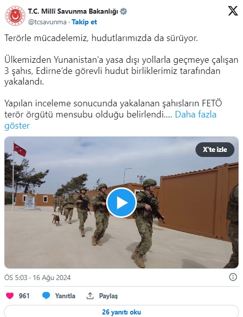 Bakanlıktan yapılan açıklamada, "Terörle mücadelemiz, hudutlarımızda da sürüyor. Ülkemizden Yunanistan'a yasa dışı yollarla geçmeye çalışan 3 şahıs, Edirne'de görevli hudut birliklerimiz tarafından yakalandı. Yapılan inceleme sonucunda yakalanan şahısların FETÖ terör örgütü mensubu olduğu belirlendi." ifadeleri kullanıldı.