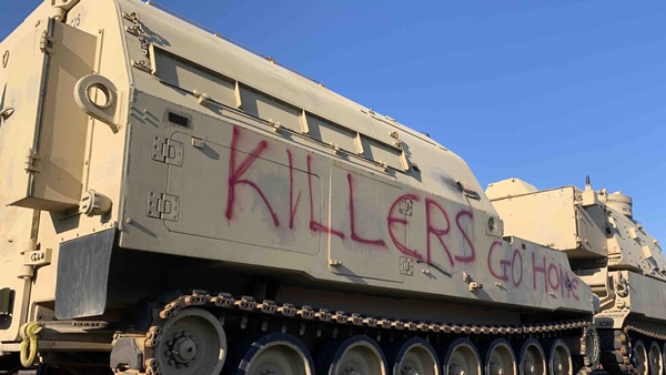 Filistin bayraklarının da taşındığı eylemde bir gösterici, trende bulunan tankın üzerine "Katiller, evlerinize dönün." yazdı.