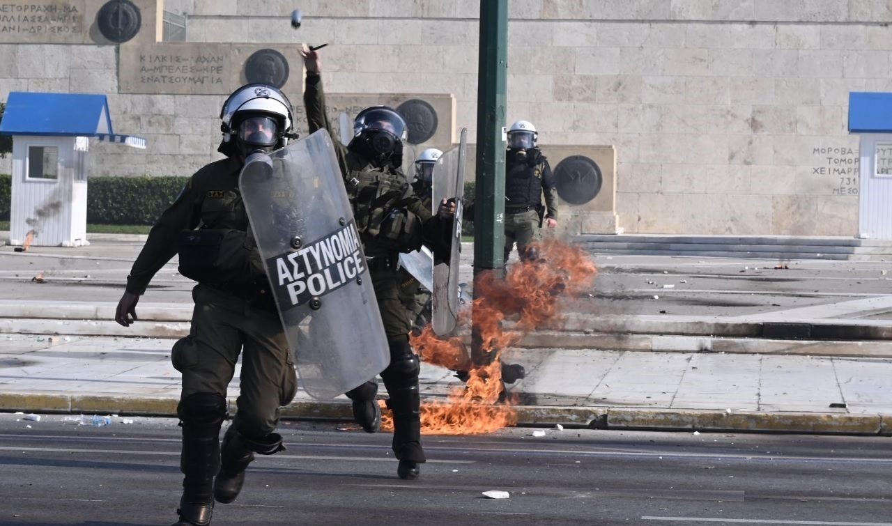 Göstericilerin Yunan Parlamento Binası’na doğru ilerleyişi sırasında, polisle göstericiler arasında zaman zaman arbede yaşandı. Ön gruplar arasında, molotofkokteyli ve sopalarla ilerleyen göstericilere, polis bazı noktalarda göz yaşartıcı gaz ve coplarla müdahale etti. Ünlü markaların bulunduğu, turistik Ermou Caddesi üzerinde mağazalara zarar veren göstericilerden bazıları ise polis tarafından gözaltına alınırken, olaylar esnasında Norveç vatandaşı 3 turistin de gazdan etkilenerek hastaneye kaldırıldığı öğrenildi.