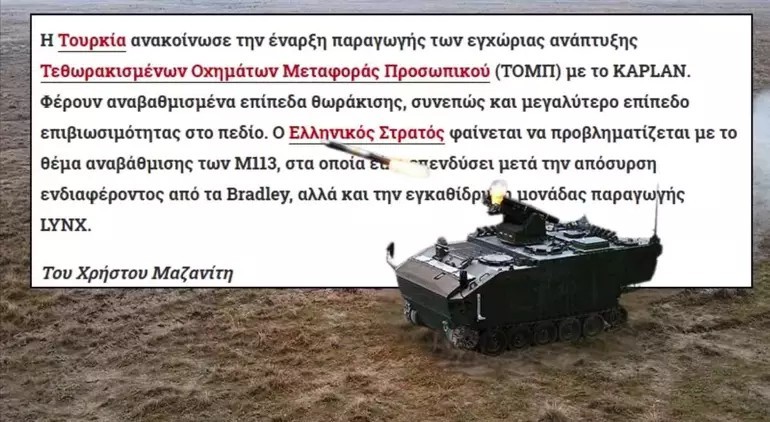 Haberde ayrıca, İsrail teknolojisiyle sınırlı sayıda modernizasyon seçeneğinin de beklentileri karşılamadığı, bu nedenle Yunan Ordusu’nun zırhlı personel taşıyıcı ihtiyacı konusunda yeniden "başlangıç noktasına" döndüğü yorumu yapıldı.