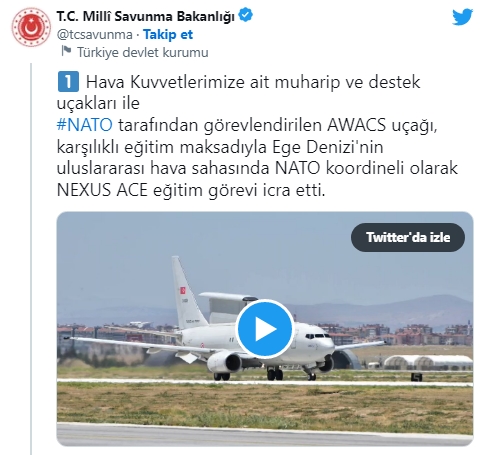 "Hava Kuvvetlerimize ait muharip ve destek uçakları ile NATO tarafından görevlendirilen AWACS uçağı, karşılıklı eğitim maksadıyla Ege Denizi'nin uluslararası hava sahasında NATO koordineli olarak NEXUS ACE eğitim görevi icra etti.