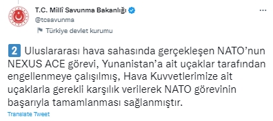 Uluslararası hava sahasında gerçekleşen NATO'nun NEXUS ACE görevi, Yunanistan'a ait uçaklar tarafından engellenmeye çalışılmış, Hava Kuvvetlerimize ait uçaklarla gerekli karşılık verilerek NATO görevinin başarıyla tamamlanması sağlanmıştır."