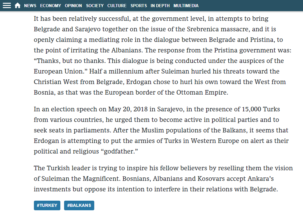 Cumhurbaşkanı Erdoğan'ın Balkan ülkeleriyle ilişkilerinin de ele alındığı yazıda, "Türkiye, Balkanlar'da stratejik ve üst düzeyde çalışıyor, etnik çatışmalara ve iç siyasi gelişmelere müdahale ediyor." denildi.