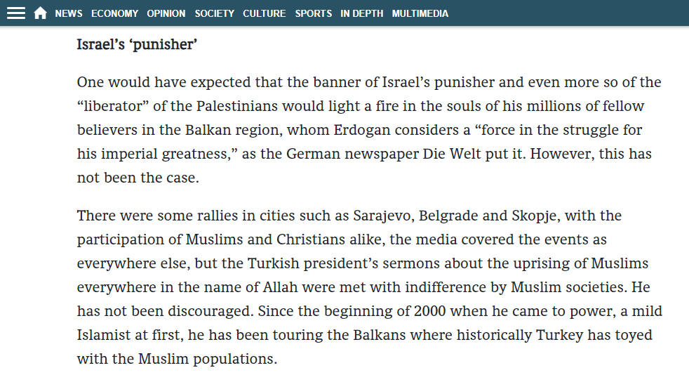 Gazete, "Görünen o ki Erdoğan, Balkanlar'daki Müslüman halkların ardından Batı Avrupa'daki Türk ordularını da alarma geçirmeye çalışıyor." yorumunu yaptıktan sonra, Erdoğan korkusunu şöyle özetledi: