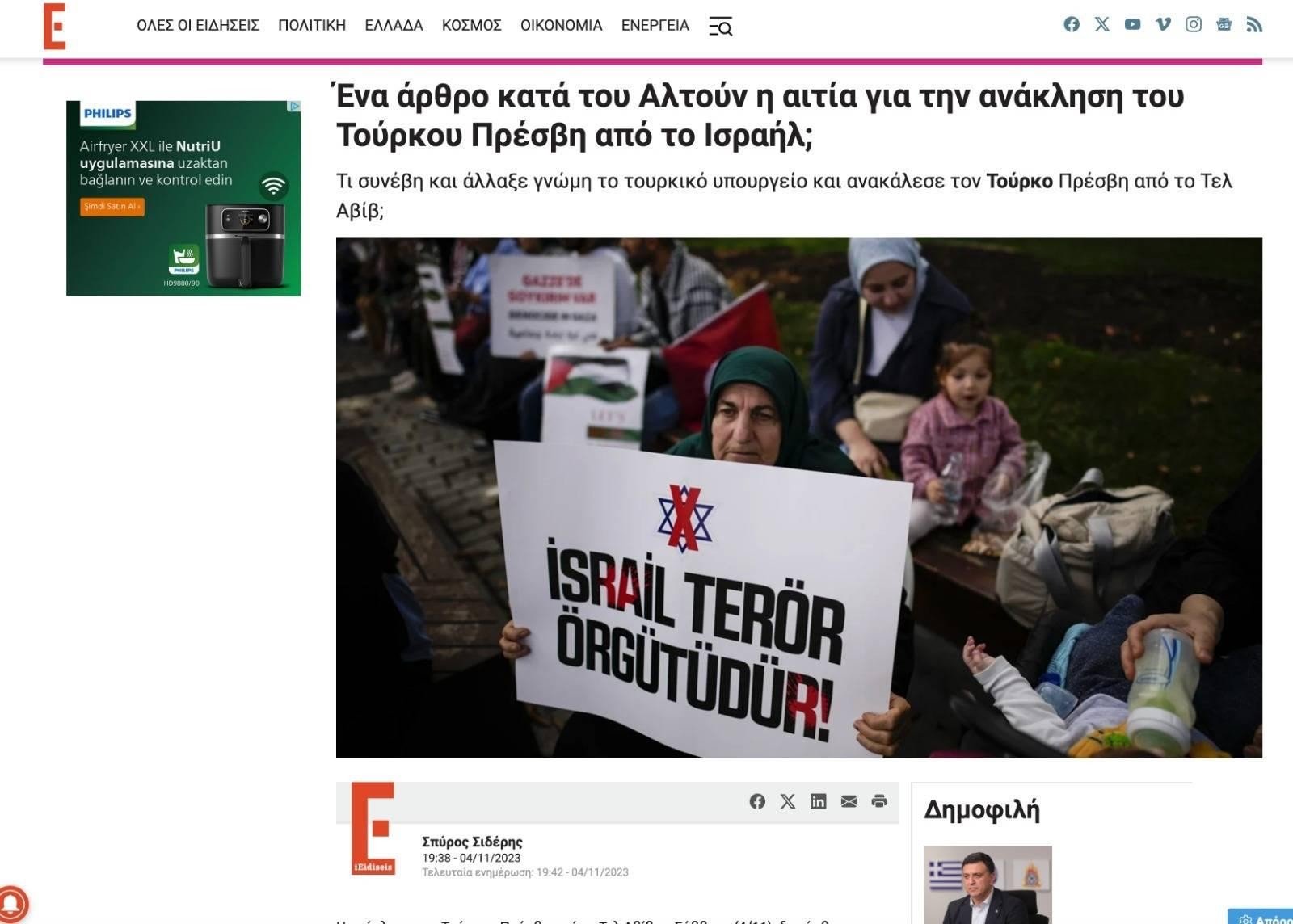 Yunanistan’ın en çok okunan haber sitesindeki yazıda İsrailli yayın organı The Times Of Israel’de yayınlanan Fahrettin Altun temalı yazıya destek veriliyor.