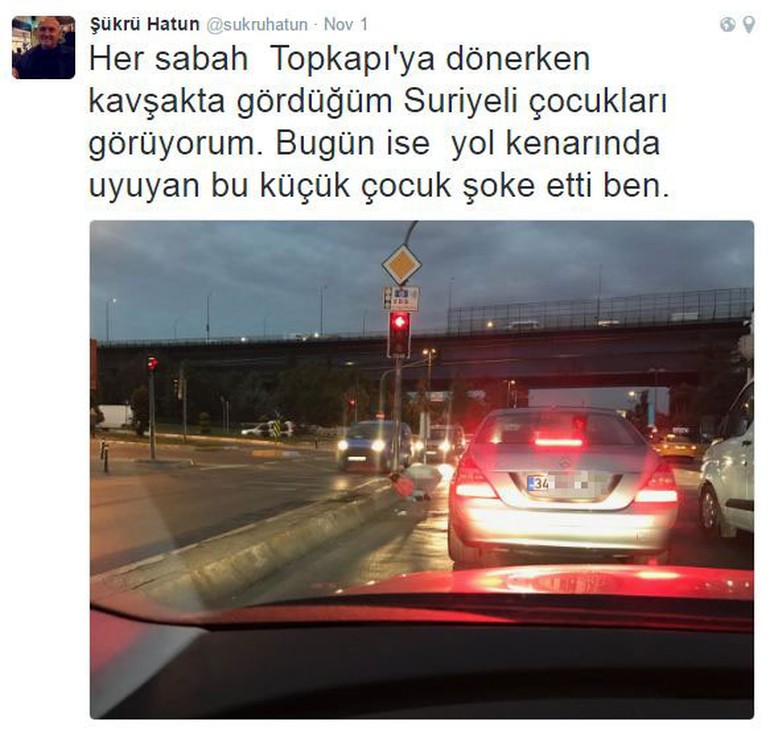 "Her sabah Topkapı'ya dönerken kavşakta gördüğüm Suriyeli çocukları görüyorum. Bugün ise yol kenarında uyuyan bu küçük çocuk şoke etti ben."