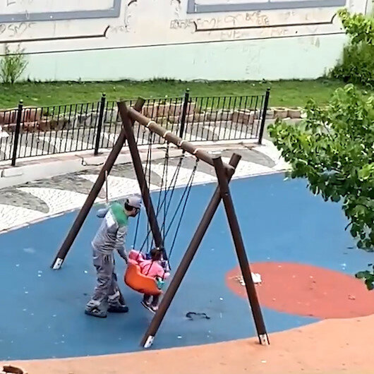 Yunus Emre Mahallesi'nde Cennet Taşçıoğlu Parkı'nda temizlik görevlisi Ömer Tuncer'in çocuğu salıncakta sallama görüntüsü sosyal medyada ilgi gördü.